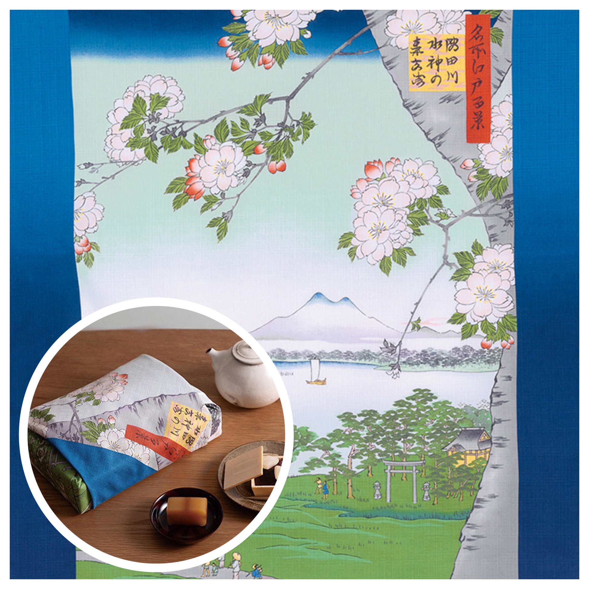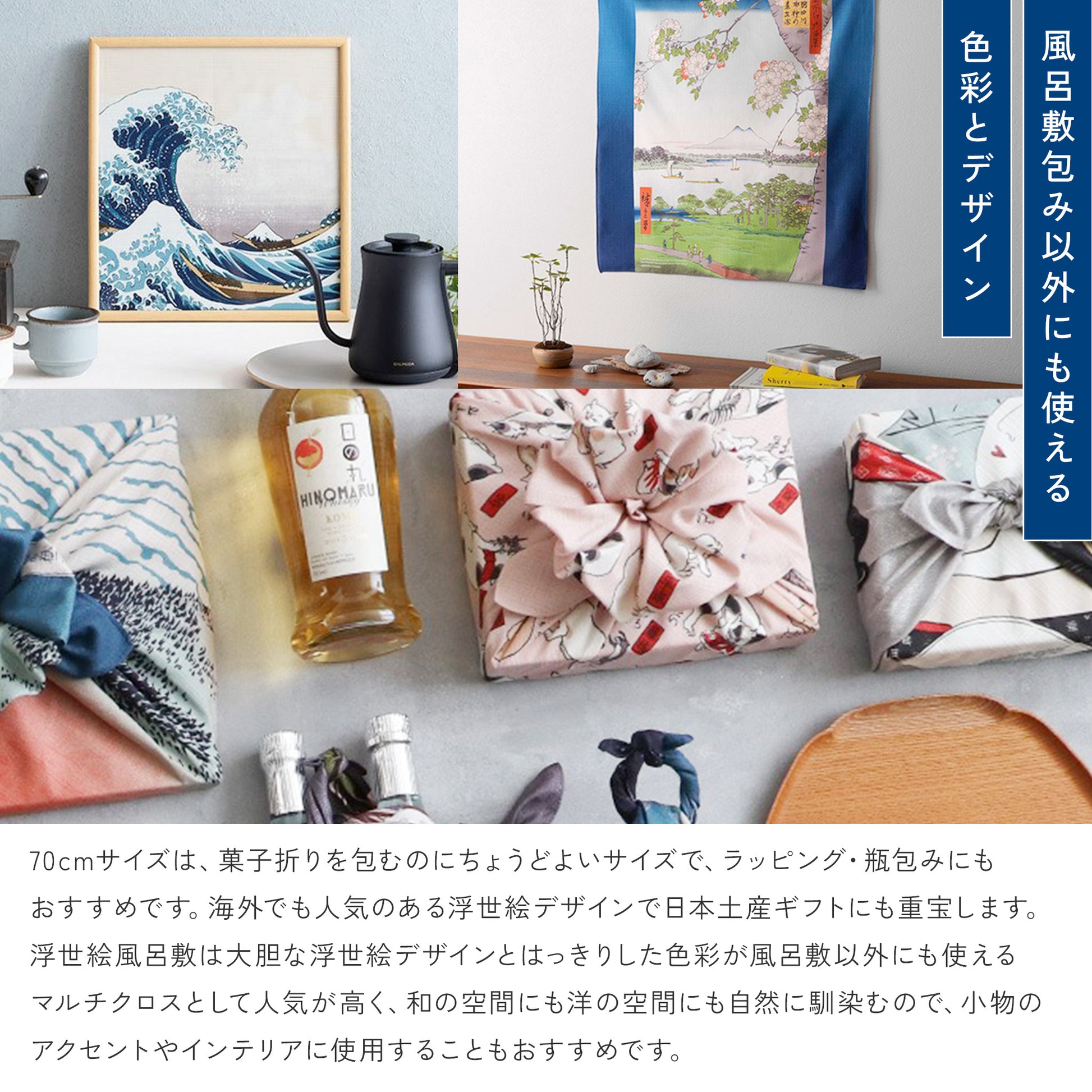 ギフトのお包みだけでなく、浮世絵を生かして額やタペストリーとして室内アートにしたり、風呂敷バッグやインテリアクロス、アパレルクロスとしても人気が高く、和洋どちらの空間にも映える文様と色彩を楽しめます。